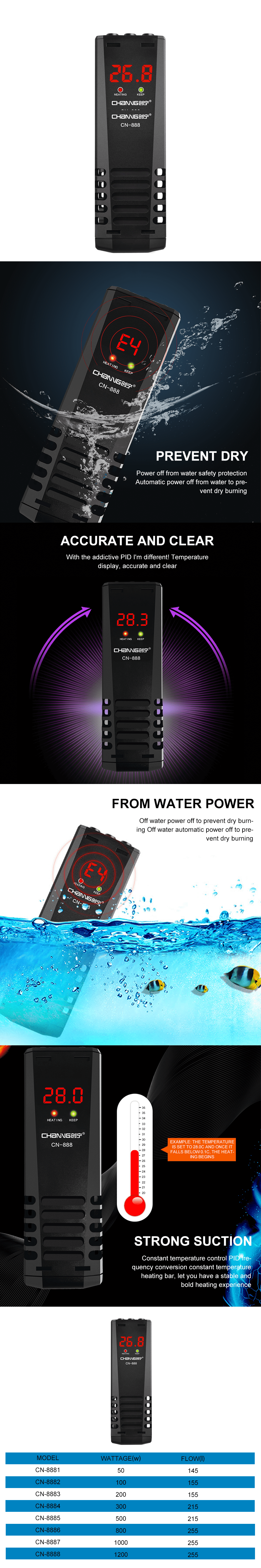 The heating rod shell of this product is made of high-temperature resistant ABS material, which is not deformed or softened at high temperature, can withstand a certain gravity without damage, safe and durable, intelligent constant temperature, disconnected from water and power off, safe and non-leakage, intelligent digital display, abnormal alarm, and external controller.