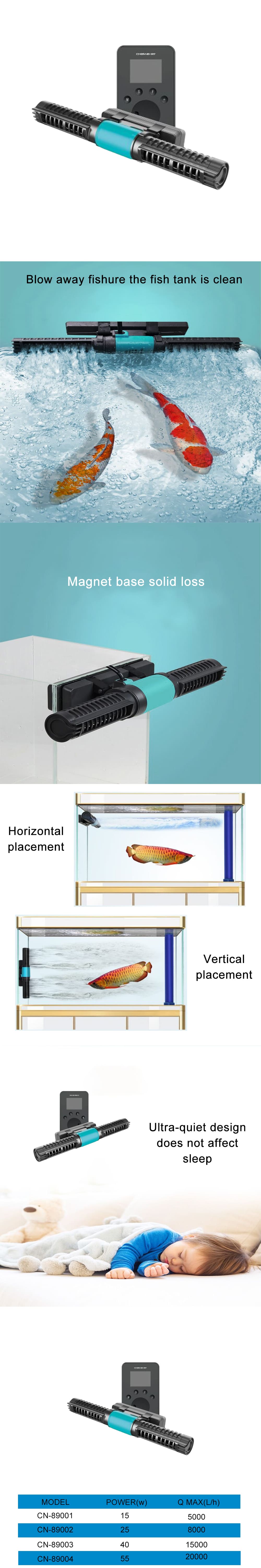 This product is a DC cross-flow wave pump for aquariums. It adopts a sine wave DC brushless motor, and there is almost no sound when using it. The circulation pump can drive the flow of water in the whole tank, make the water temperature more uniform, blow away the fish manure, and keep the fish from getting sick.The magnet suction cup is stable and does not fall off, and the voltage is safe.