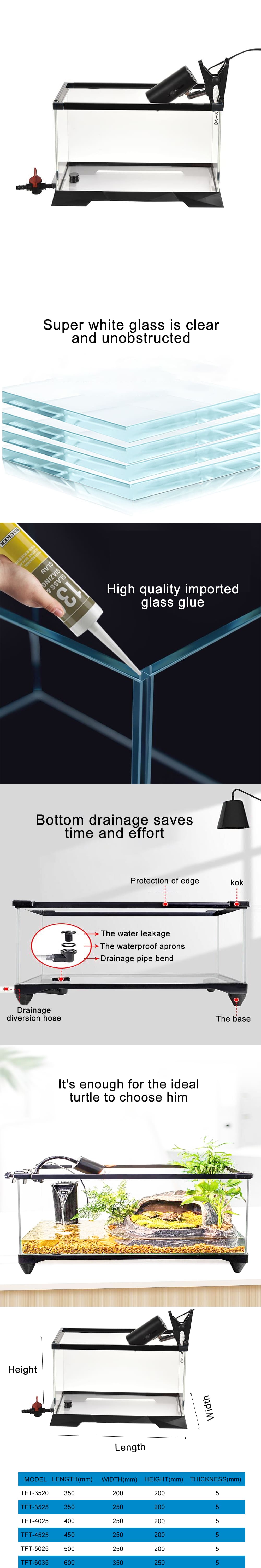 The product is made of thickened and solid glass, which is strong and safe, with high gloss and durability. It uses double-sided glue technology inside and outside to prevent water leakage. The bottom is edged with heightened and thickened ABS plastic, and the upgraded drainage holes are located at the bottom. The waterproof rubber ring prevents the drainage holes from leaking. The large space avoids the drying platform, which can be used for sunbathing, dodging, landscaping, and planting to give the turtle a natural and warm ecological environment.