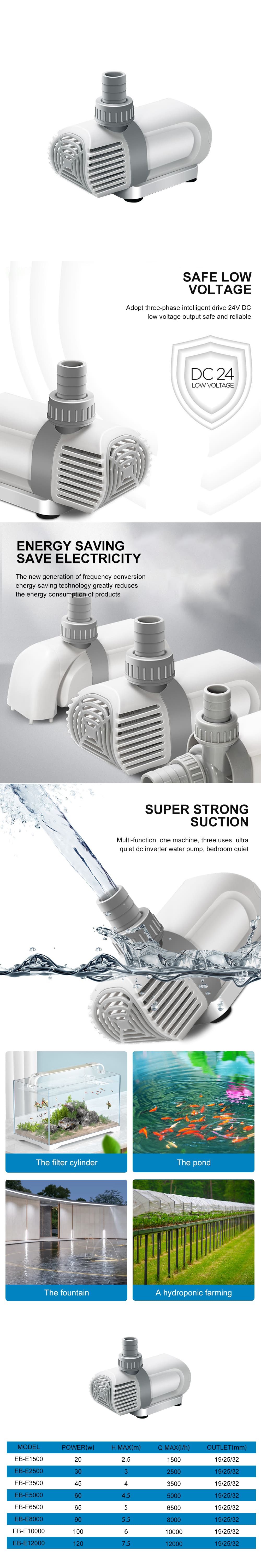 This product is a DC low-voltage side-suction variable frequency pump for aquariums. It is universal for freshwater, seawater, land and water. It is small in size and suitable for all kinds of fish tanks. It can be supplied in a variety of specifications. It can create waves to make the fish full of vitality, safe voltage.